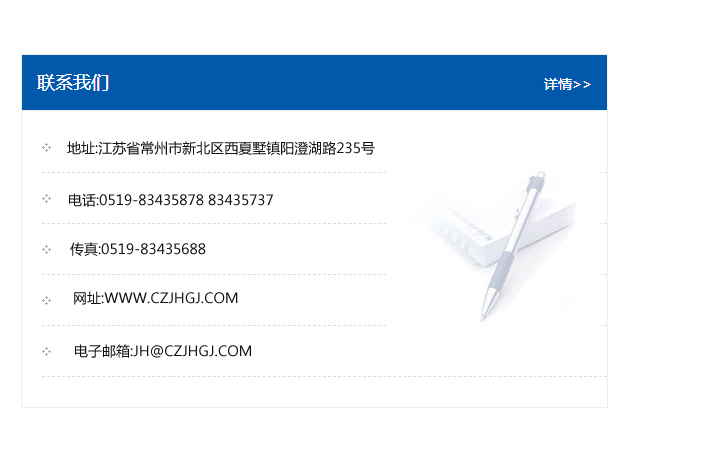 地址:常州市新北區友邦商務大廈1幢16、17層  電話:0519-85101652  傳真:0519-85112595  郵編:213022  網址:www_cz-jiayue_cn.sparklegz.com  郵箱:xiajifengaa@163.com